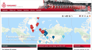 Den utmärker sig vidare genom att tydligt och på framskjuten plats markera att danskt försvar opererar i hela världen. Detta tydliggörs genom en världskarta med nålliknande symboler utsatta vid de platser där försvaret just nu bidrar. Markeringarna har olika färger: vitt står för koalitioner, sidans mörkröda effektfärg för nationella uppgifter, mörkblått för NATO, ljusblått för FN. Kartan är interaktiv. Klickar man på en av de färgade markeringarna får man upp basfakta om insatsens namn, eventuella partners, hur många medarbetare som är involverade, och vilken uppgift de har. Men för att skydda de berörda är platsangivelserna ungefärliga.