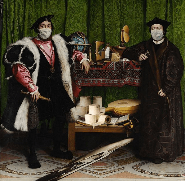 Ambassadörerna av Hans Holbein den yngre (1533), men modifierad av Genevieve Blais (2020), är ett dubbelporträtt föreställande den franska ambassadören i England under 1500-talet, Jean de Dinteville, och hans vän biskop Georges de Selves. Deras blickar är riktade mot betraktaren och de poserar för oss genom att luta sina armar mot ett bord med diverse objekt relaterade till navigation, musik och religion samt en hög med toalettpappersrullar (se bild 1). Förutom sina extravaganta och tidsenliga kläder bär de även på engångsansiktsmasker som vi idag använder i covid-19-pandemin. På golvet finns en illusion, eller ett anamorfiskt perspektiv som det även kallas, av ett människokranium som man endast kan se i en viss vinkel. Detta kranium symboliserar dödlighet. Genevieve Blais har även lagt till en kommentar på sin Instagrambild av ambassadörerna, ”The new kind of wealth”, som refererar till hamstringen av toalettpappersrullarna.