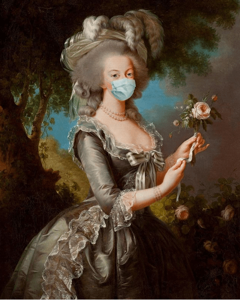 Covid-19-pandemin gav en stor skara människor tid och vilja att skapa och uttrycka sig genom konst. Denna konstnärlighet har kunnat ta sig i uttryck som mem och parodier av kända personer eller fenomen. Speciellt ansiktsmasker har förekommit i diverse konstverk världen över som en reflektion av vår samtida situation, vilket BBC rapporterar om (How masks appeared in art 2020). Genevieve Blais är en av dem som har tagit inspiration av pandemin och skapat konstverk baserade på fenomen som uppkommit i och med coronan, exempelvis användningen av munskydd och hamstringen av toalettpappersrullar. Hon är en kanadensisk fotobaserad konstnär, känd för verk som både involverar konsthistoria och teoretiska narrativ. Hon använder sig av bekanta objekt och historier men förändrar dem till en fantasifull representation av vad de en gång varit. På sin webbsida beskriver Genevieve att sexualitet, mortalitet och symbolism genomsyrar verken (Genevieve Blais 2020). När covid-19 inträffade skapade hon ett alternativt Instagramkonto med namnet plaugehistory, dedikerat till konsthistoriska modifierade verk där hon bland annat lagt till ansiktsmasker på kända målningar. Den första Instagrambilden på denna sida är från mars 2020, och under året som gått har hon skapat mer än hundra bilder på samma tema, med målningar som Leonardo da Vincis Mona Lisa och Michelangelos David (plaugehistory 2020) som grund. På webbsidan boredpanda där Genevieve har ett eget konto kommenterade hon sitt val att uppdatera konsthistorien för 2020 med att ”We could all use a smile in lieu of recent events” (Classic paintings reimagined 2020).