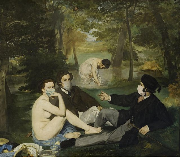 Den ursprungliga målningen gjordes på 1800-talets senare hälft och gav upphov till skandal. Folk ansåg att den var chockerande, och tog avstånd från konstverket, bland annat på grund av att nakna kvinnors sågs tillsammans med påklädda män, vilka dessutom hade samtida kläder. Det betydde att det inte handlade om ett motiv från den grekiska mytologin, där nakenhet var mera accepterat. Idag kunde man möjligtvis se en liknande reaktion på gruppen i konstverket, men inte på grund av de nakna kvinnorna och påklädda männen, utan för att de inte följer rekommendationerna för distansering, vilket Blais antyder i sin text. Dock vistas de ute i naturen och använder ansiktsmasker (förutom kvinnan i dammen som även har ett längre avstånd till de andra).