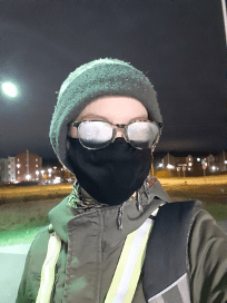Munskydden försvårar också identifieringen av oss. Det här var inget jag reagerade på förrän damen vid lokaltrafikens servicekontor bad mig att ta av mig mitt munskydd så att hon kunde se att det verkligen var jag på mitt ID. När jag tog upp saken med andra studerande berättade de att samma hänt dem när de besökt banken och Alko. Däremot fick jag ta ut ett paket från posten och köpa alkohol från en matbutik trots att jag såg ut såhär:
