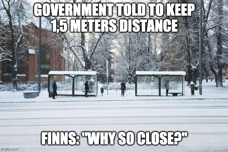 Dels driver detta mem med den finska stereotypen att en vill hålla så mycket avstånd som möjligt. Det myllrar av icke-covidrelaterade mem där folk skrattar åt de avstånd man inom den finska befolkningen håller till varandra. Den finländska stereotypen här avläses genom människor utspridda över två busshållplatser, samt snön som är närvarande. Finland framställs som ett kallt land, och finländarna som ett ”kallt” folk som ogärna vill komma varandra nära.