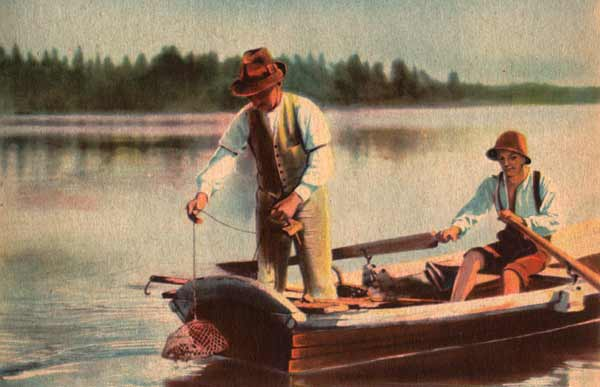 Den 15 augusti börjar kräftfångsten. Det blir liksom nytt lif i oss då. Alla burarna, håfvarna och spöna äro i ordning, och när klockan slår tolf på natten ror jag ut, det må vara hvilket väder det vill, och i djupsvarta natten sänker jag håfvarna i det ännu svartare vattnet; sofver så till klockan fem då de större barnen väckas; och så vittja vi under det solen i morgondimman går upp som en pannkaka öfver vasstopparna. Bilden med det dukade bordet förklarar tillräckligt det öfriga, tänker jag.