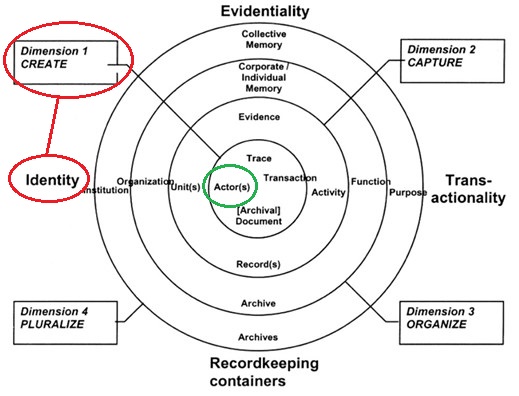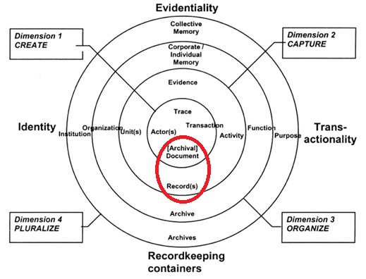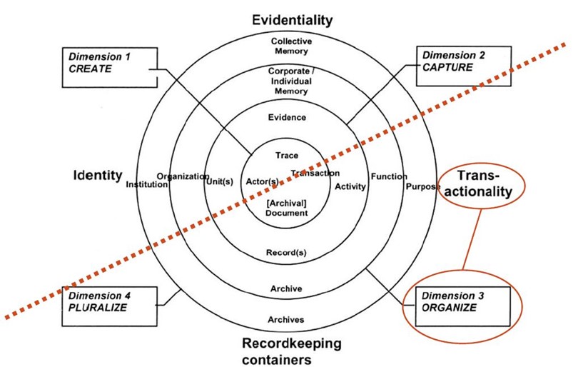 Högst upp står bevisbarhet (Evidentiality), processen genom vilken en handling går från att vara ett spår av en aktivitet till ett bevis, och ett minne som upptas i ett kollektivt minne på ett större eller mindre plan. Till höger ligger överföring (Transactionality), det vill säga hur handlingarna sprids och används, samt deras funktioner och användningsändamål. Längst ner ligger handlingsbehållarna (Recordkeeping containers), händelserna som dokumenterats i fysisk form, de fysiska handlingarna och deras förvaring i arkiv.