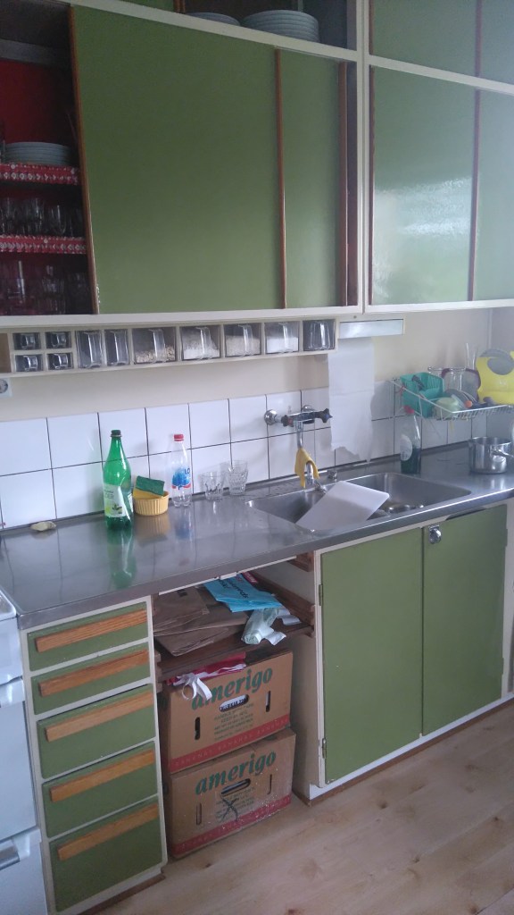 Upplevelsen av att ha tagit fel beslut gällande tapeten i hallen har i sin tur saktat ned renoveringsplanerna för resten av huset. Informanterna är måna om att inte ta några fler förhastade beslut och därigenom undvika att upprepa misstaget med tapeten i hallen. Husets kök är efter sju år i parets ägo fortfarande orört. De tidstypiska detaljerna fångade parets intresse när de såg köket på bilderna via mäklarfirmans hemsida. Det är utrustat med arbetsbänk i rostfritt stål och över diskbänk och spis sitter två rader rektangulära kakelplattor. I övrigt är luckor och lådfronter grönmålade och den ursprungliga fondtapeten tapetserades över på 1970-talet med beige vävtapet. De skjutbara skåpsluckorna är tidstypiska för 1950-talet liksom de remsor som dekorerar hyllkanterna innanför. Paret ger uttryck för att de uppskattar utrymmet som det är, samtidigt var köket det som skulle bli deras nästa renoveringsprojekt. Liksom de flesta husköpare vill de sätta sin egen prägel på fritidshuset. Färgskalor och eventuella tapeter har diskuterats flitigt sedan övertagandet, berättar de. Paret har avlägsnat en del av den senare tapeten från 1970-talet och exponerat en liten bit av den ursprungliga tapeten i köket. Den kommer inte gå att rädda, men kanske kan den fungera för att guida dem i valet av färger och mönster till rummet. De måste dock fortfarande ta beslut om hur de ska gå vidare med renovering av rummet.