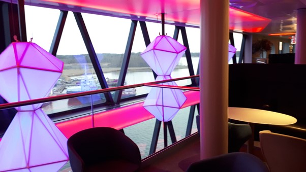 Viking Grace var år 2012:s sensation och Viking Glory i sin tur är den nyaste båten i rederiets flotta, ett lyxfartyg från 2019 vars interiör var välkänd för oss innan skeppet ens sjösatts på grund av den uppmärksamhet det fått bland annat i media. Där Graces interiör domineras av en massiv geometrisk konstinstallation framför ett fönster som sträcker sig över tre av skeppets våningar, ligger en scen med en massiv digital skärm synlig på två våningar i centrum för Glory. Det är kring dessa centrala utrymmen allt och alla samlas i respektive fartyg. Den gemensamma nämnaren för dessa två platser är ljus och sittplatser. Ljus påverkar var människor stannar upp, vi har en tendens att söka oss till platser med mycket naturligt ljus (Ahmadi 2019). Under resorna med bägge fartyg var det också tydligt att majoriteten av passagerarna sökte sittplatser kring fönster. Både fönstret i Grace och överflödet av ljuskronor, i kombination med speglar och guld, i Glory skapar väl upplysta utrymmen som påminner starkt om ett lyxhotell.