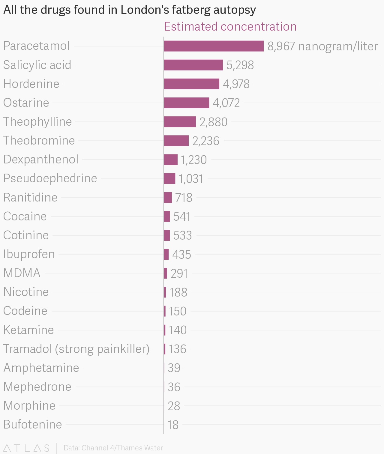 I en dokumentär om ett senare fettberg, hittat våren 2018, blev monsterfettberget bokstavligen upplagt på ett dissektionsbord och isärplockat i sina beståndsdelar likt ett ”enormt, fruktansvärt lik” (Golby 2018). Som i en obduktionsrapport redovisas de främmande substanser som fettberget innehåller utöver fett och aska, som till exempel kokain och amfetamin. Men också acnekräm, tvål, paracetamol och anabola stereoider (Harrison 2018). Våra kroppsliga och mentala ideal framträder i form av sådant som skönhetsprodukter, kroppsuppbyggande preparat, och prestationshöjande medel. ”Allt som vi stoppar in i våra kroppar kommer att synas här i fettberget” säger en av experterna som analyserar fettberget i dokumentären (Channel 4 2018). Det är individen som bär skulden till förloppet i avloppet, genom sina matvanor och sin livsstil, samtidigt som fettbergsmassan också ansamlar och vittnar om människors vanor och hemligheter.